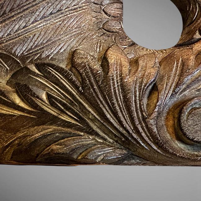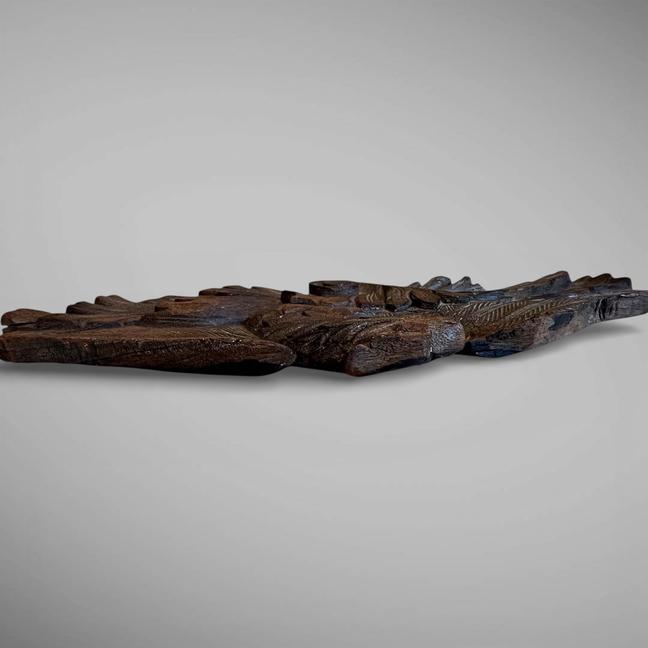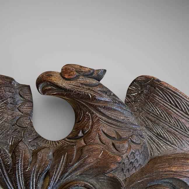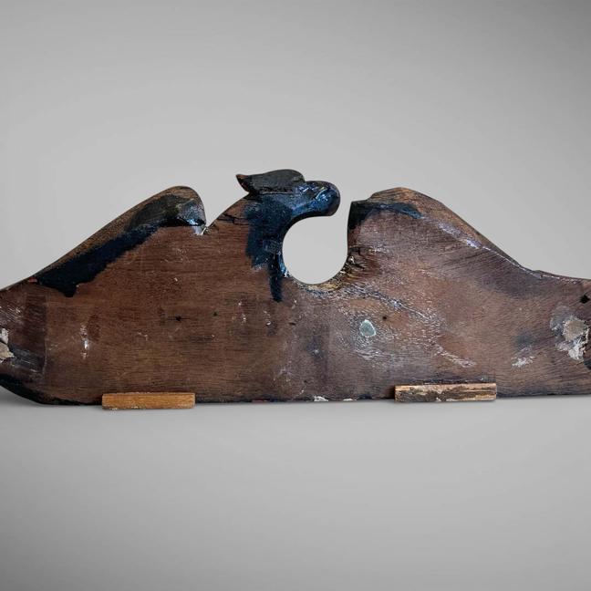 This fine little carved eagle was most likely an architectural ornament or possibly off the crest of a piece of furniture. Carved out of walnut, with two small mounting blocks on the back. In fine, as-found condition. Measuring just 13 1/4" wide by 4 3/8" tall, with a board thickness of 3/4" (not counting the small blocks).