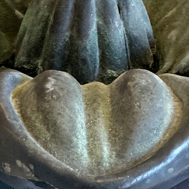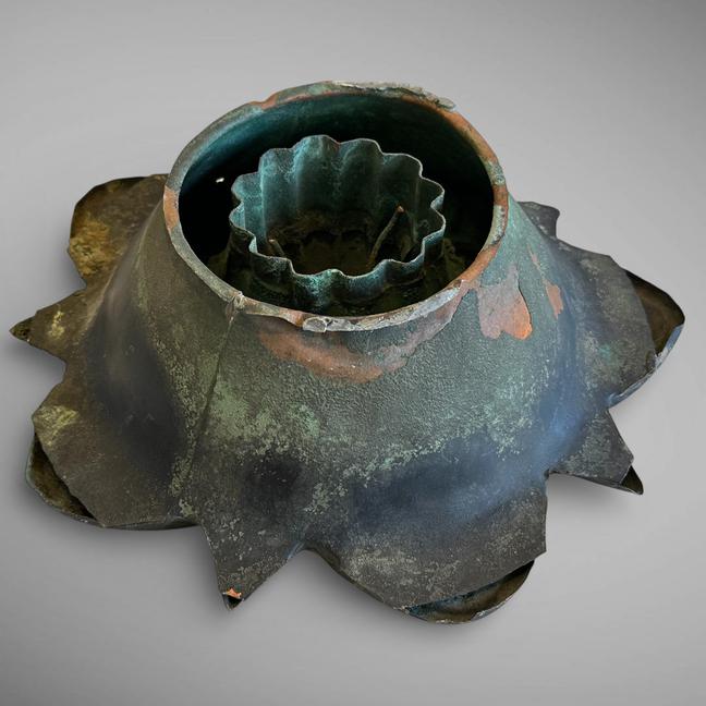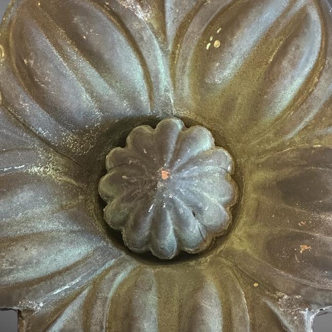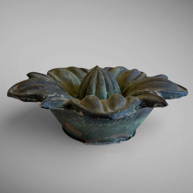 This unique copper rosette or flower has spent its life outside in the elements which has created a wonderful blackish-verdigis surface. This rosette was most likely a copper emblellishment on the exterior of a building. It's hollow, yet has some weight to it.