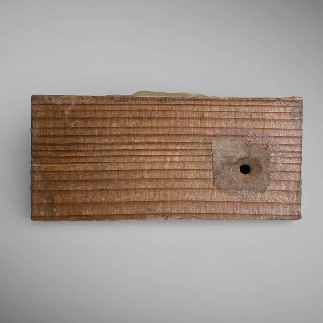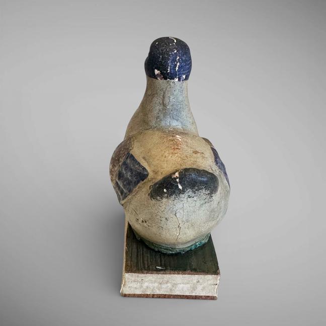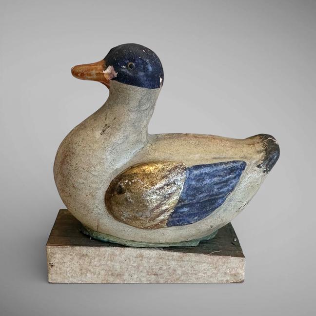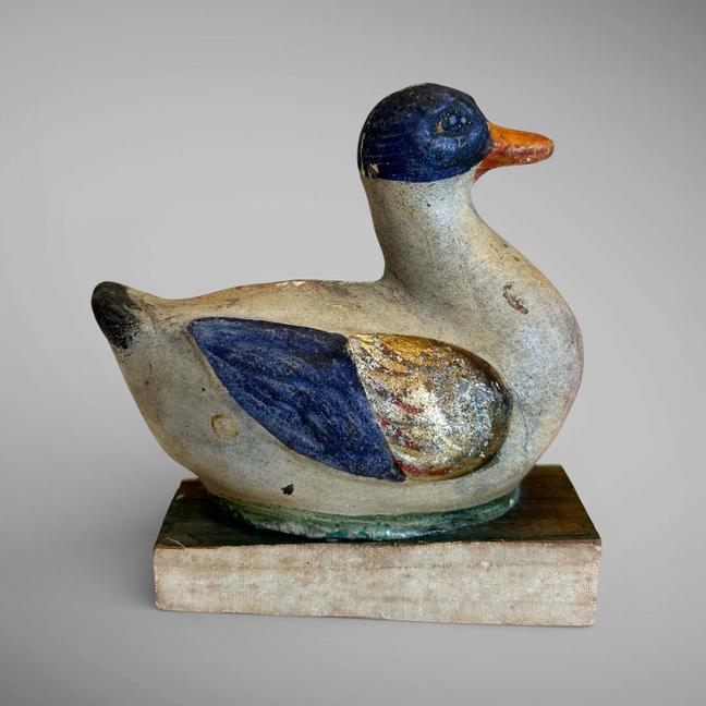 This early composition Squeak toy is in the form of a duck. It still retains its vibrant colors, with the wings appearing to have gold leaf on them. It is mounted on a wooden base, sides covered with soft kid leather. The squeak mechanism is not working, but it is still an unusual example. Measuring 4 1/4" w by 2 1/4" d by 4 1/2" t. Germany, ca 1860.