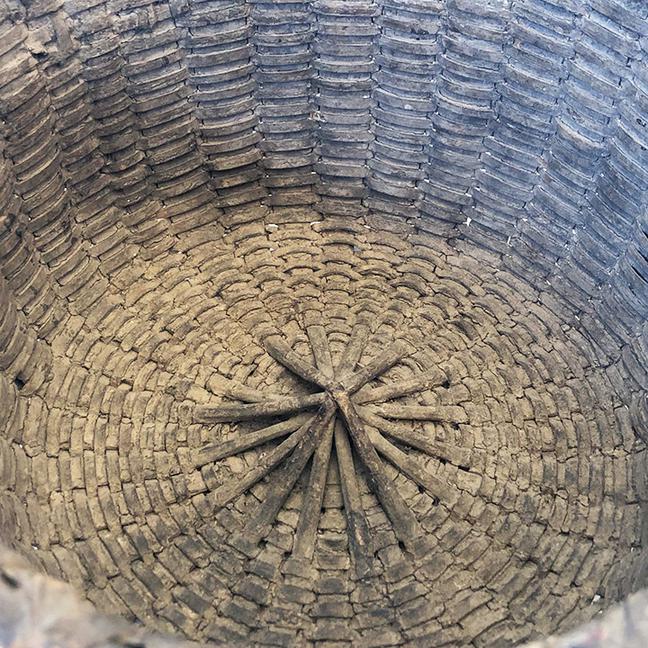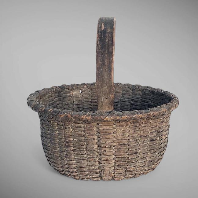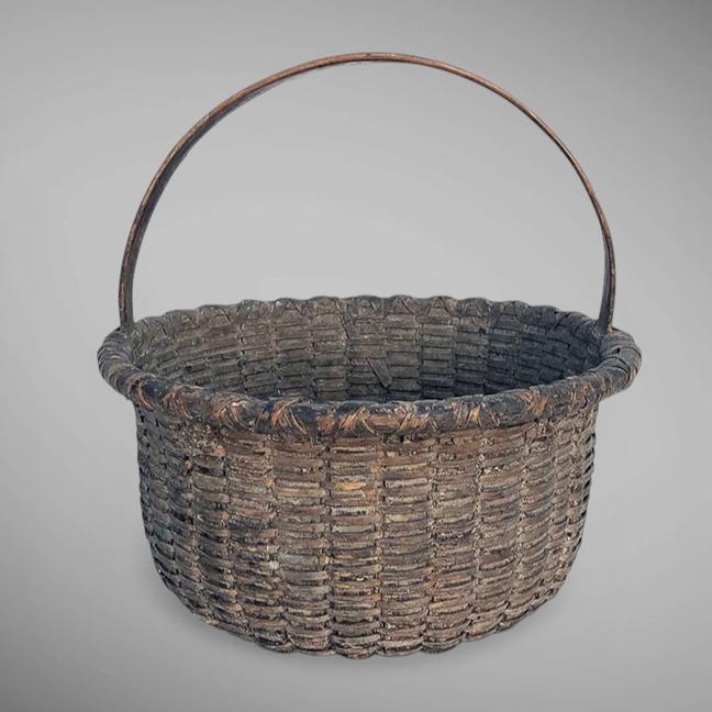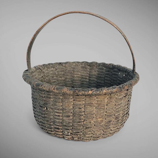 This early basket retains a heavy paint gray, with tiny remnants of white and black. This basket is somewhat heavy for its size. It has a nice tight weave and a double-wrapped rim. Notice the nice kick-up on the inside. Scattered, very minor, imperfections. See photos. Measuring 9 1/2" to 10" wide (very slightly out of round) by 9 1/2" to top of handle. A fine early painted basket!
