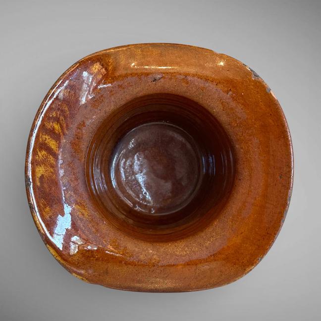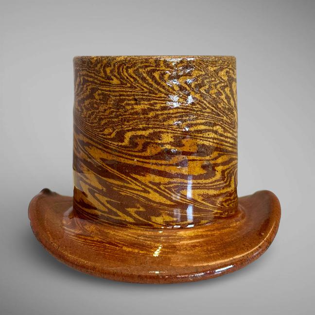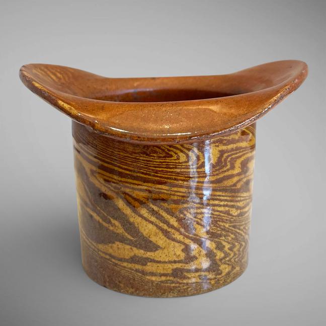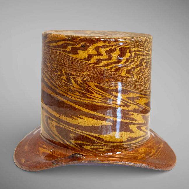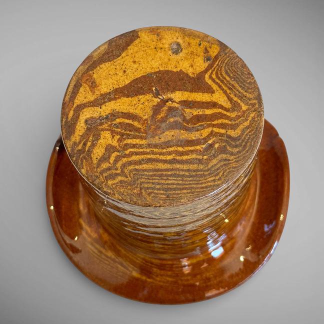 This is one of the more unusual examples I have seen. It is lead-glazed in the form of a top hat. In excellent condition. Measuring 4 1/4" tall by 5 5/8" in diameter at the rim, and 3 5/8" diameter at the top of the hat. Mid to late 19th century.