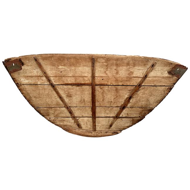 This is an early winnower. Winnowers were used to separate grain from chaff, which was typically done after the threshing. But today they can be used as wall decor, perfect for displaying florals and other things. The last image below shows an example of how it can be displayed. This image is of another winnower, not this one, although very similar. This piece measures 59 1/4" wide by 29" tall by 9" deep (excluding the handles). The two corners have make-do tin patches for support. And there is surface wear commensurate with age and use. A nice primitive piece!