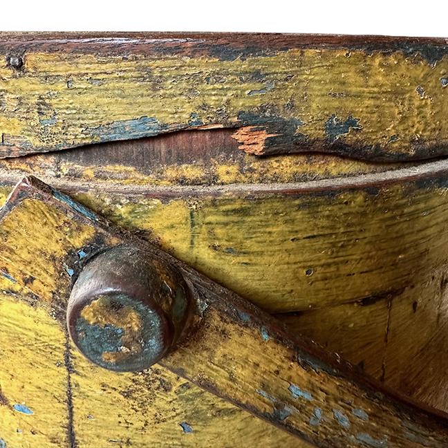 This little firkin is a nice small size, perfect for the top or near top of the stack. It is adorned in an early chrome yellow over the original blue. The lapped finger bands secure the staves. With mushroom knobs holding securing the handle. Measuring a nice small desirable size of 8 1/2" tall (not counting the handle), with a base diameter of 10", and a lid diameter of 9 1/4". With surface imperfections consistent with age and use. A great early firkin in a desirable small size!